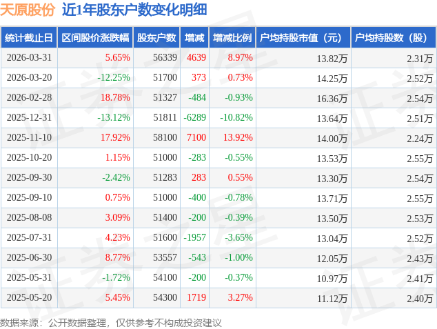 证券之星消息,近日天原股份披露,截至2026年3月31日公司股东户数为5.63万户,较3月20日增加4639.0户,增幅为8.97%。户均持股数量由上期的2.52万股减少至2.31万股,户均持股市值为13.82万元。