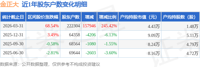 证券之星消息,近日金正大披露,截至2026年3月31日公司股东户数为22.23万户,较12月31日增加15.79万户,增幅为245.42%。户均持股数量由上期的5.11万股减少至1.48万股,户均持股市值为4.43万元。