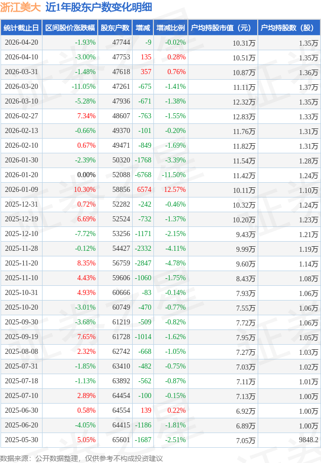 从股价来看,2026年4月10日至2026年4月20日,浙江美大区间跌幅为1.93%,在此期间股东户数减少9.0户,减幅为0.02%。