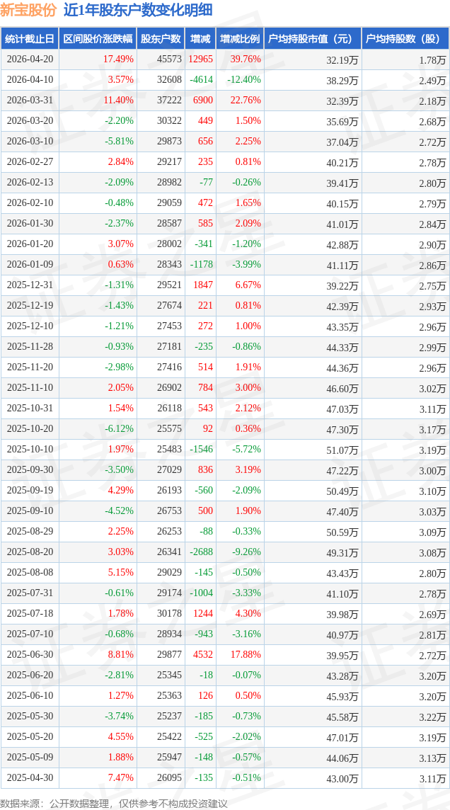 证券之星消息,近日新宝股份披露,截至2026年4月20日公司股东户数为4.56万户,较4月10日增加1.3万户,增幅为39.76%。户均持股数量由上期的2.49万股减少至1.78万股,户均持股市值为32.19万元。