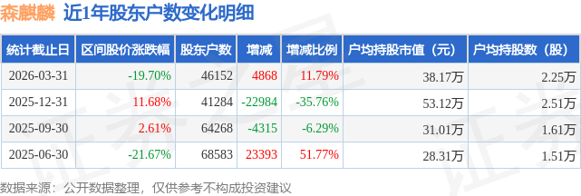 证券之星消息,近日森麒麟披露,截至2026年3月31日公司股东户数为4.62万户,较12月31日增加4868.0户,增幅为11.79%。户均持股数量由上期的2.51万股减少至2.25万股,户均持股市值为38.17万元。