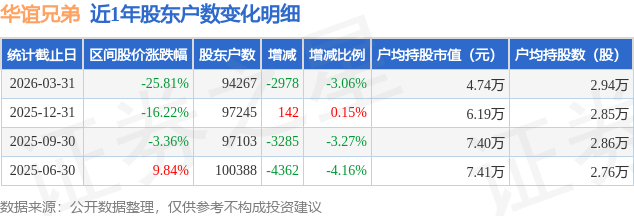 从股价来看,2025年12月31日至2026年3月31日,华谊兄弟区间跌幅为25.81%,在此期间股东户数减少2978.0户,减幅为3.06%。