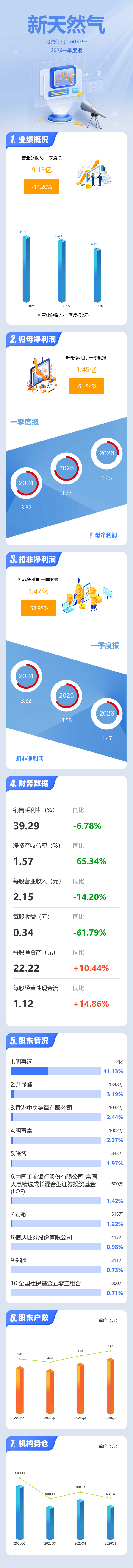 证券之星消息,新天然气2026年一季报显示,一季度公司主营收入9.13亿元,同比下降14.2%;归母净利润1.45亿元,同比下降61.55%;扣非净利润1.47亿元,同比下降58.96%;负债率48.63%,投资收益120.87万元,财务费用6338.37万元,毛利率39.29%。