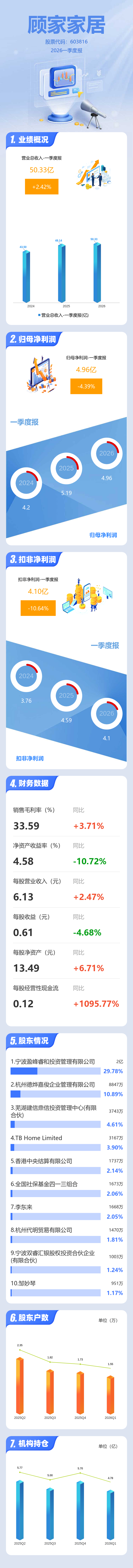 证券之星消息,顾家家居2026年一季报显示,一季度公司主营收入50.33亿元,同比上升2.42%;归母净利润4.96亿元,同比下降4.39%;扣非净利润4.1亿元,同比下降10.64%;负债率39.87%,投资收益3930.99万元,财务费用4897.09万元,毛利率33.59%。