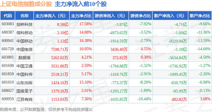 资金流向方面,上证电信(000040)指数成份股当日主力资金净流出合计10.26亿元,游资资金净流出合计2.14亿元,散户资金净流入合计12.4亿元。成份股资金流向详情见下表: