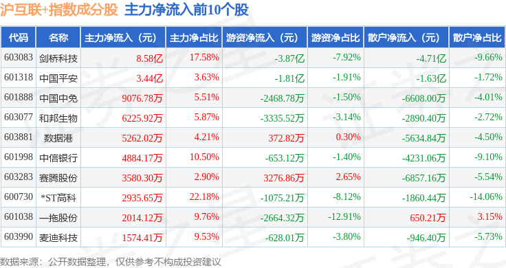 资金流向方面,沪互联+(000162)指数成份股当日主力资金净流出合计26.05亿元,游资资金净流入合计5.27亿元,散户资金净流入合计20.78亿元。成份股资金流向详情见下表: