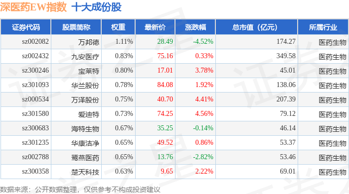证券之星消息,4月29日,深医药EW(399676)指数报收于3830.36点,涨0.56%,成交597.3亿元,换手率2.44%。当日该指数成份股中,上涨的有142家,兰卫医学以10.85%的涨幅领涨,下跌的有75家,海翔药业以9.99%的跌幅领跌。