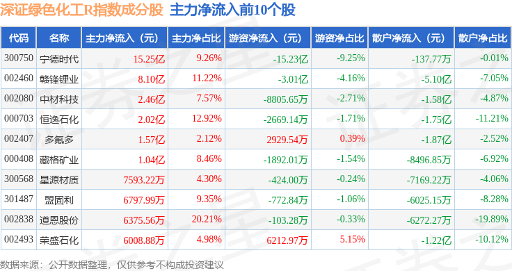 资金流向方面,深证绿色化工R(470076)指数成份股当日主力资金净流入合计28.33亿元,游资资金净流出合计16.25亿元,散户资金净流出合计12.08亿元。成份股资金流向详情见下表: