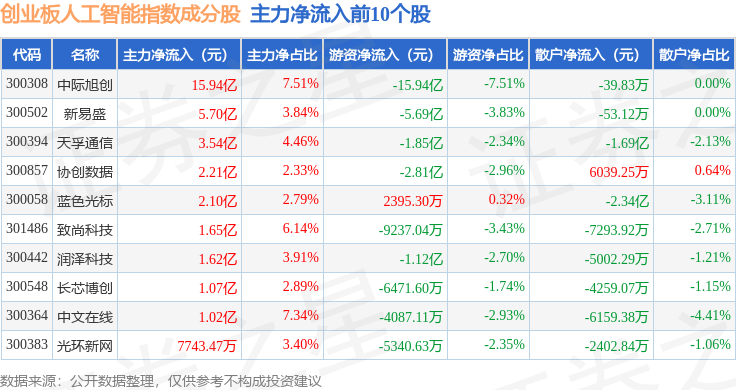 资金流向方面,创业板人工智能(970070)指数成份股当日主力资金净流入合计24.6亿元,游资资金净流出合计30.7亿元,散户资金净流入合计6.11亿元。成份股资金流向详情见下表: