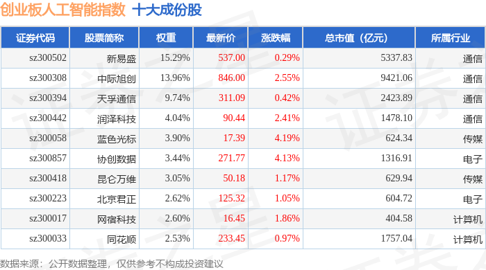 创业板人工智能(970070)指数十大成份股详情如下: