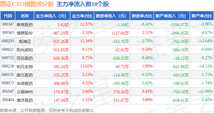 资金流向方面,国证CXO(980120)指数成份股当日主力资金净流出合计9.06亿元,游资资金净流入合计2.23亿元,散户资金净流入合计6.83亿元。成份股资金流向详情见下表: