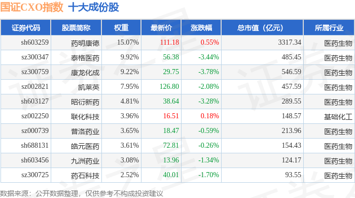 证券之星消息,4月29日,国证CXO(980120)指数报收于1850.54点,跌1.42%,成交249.0亿元,换手率3.1%。当日该指数成份股中,上涨的有17家,成都先导以5.92%的涨幅领涨,下跌的有23家,海翔药业以9.99%的跌幅领跌。
