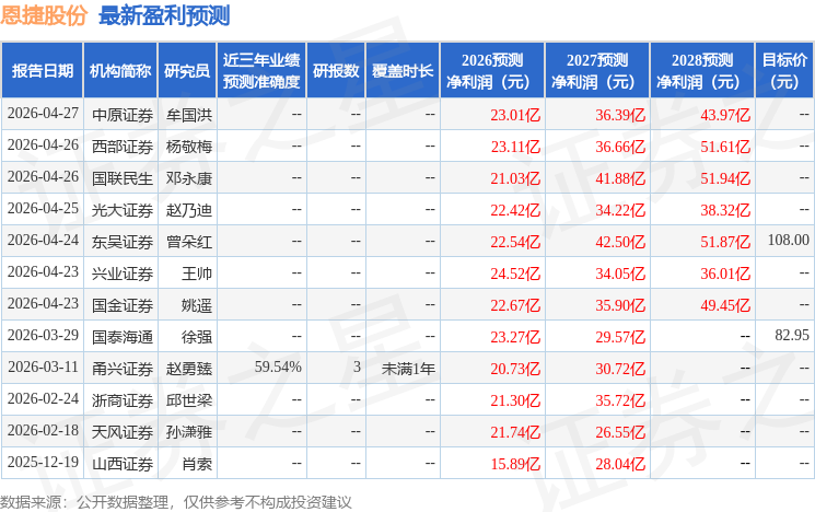 证券之星数据中心根据近三年发布的研报数据计算,甬兴证券赵勇臻研究员团队对该股研究较为深入,近三年预测准确度均值为59.54%,其预测2026年度归属净利润为盈利20.73亿,根据现价换算的预测PE为40.03。