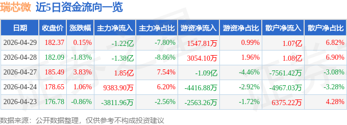 证券之星消息,截至2026年4月29日收盘,瑞芯微(603893)报收于182.37元,上涨0.15%,换手率2.08%,成交量8.76万手,成交额15.7亿元。