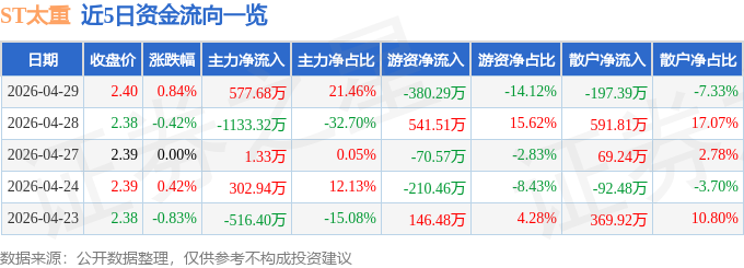 证券之星消息,截至2026年4月29日收盘,ST太重(600169)报收于2.4元,上涨0.84%,换手率0.34%,成交量11.28万手,成交额2692.41万元。