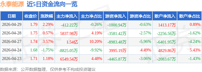 证券之星消息,截至2026年4月29日收盘,永泰能源(600157)报收于1.79元,上涨2.29%,换手率4.08%,成交量890.23万手,成交额15.9亿元。