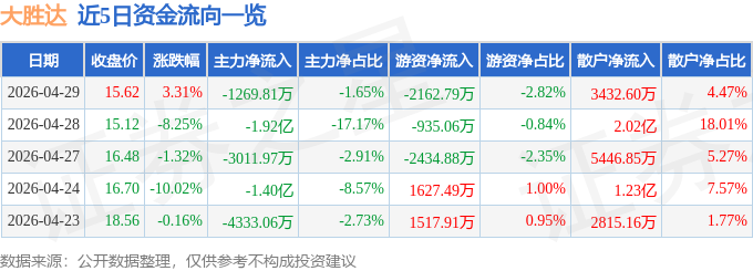 证券之星消息,截至2026年4月29日收盘,大胜达(603687)报收于15.62元,上涨3.31%,换手率9.02%,成交量49.62万手,成交额7.68亿元。