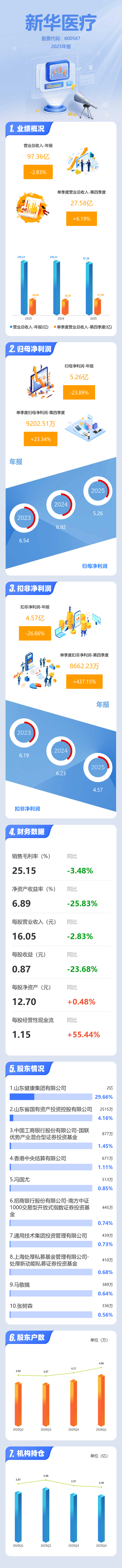证券之星消息,新华医疗2025年年报显示,当年度公司主营收入97.36亿元,同比下降2.84%;归母净利润5.26亿元,同比下降23.9%;扣非净利润4.57亿元,同比下降26.66%;其中2025年第四季度,公司单季度主营收入27.58亿元,同比上升6.19%;单季度归母净利润9202.51万元,同比上升23.34%;单季度扣非净利润8662.23万元,同比上升437.16%;负债率46.31%,投资收益3910.06万元,财务费用2751.27万元,毛利率25.15%。