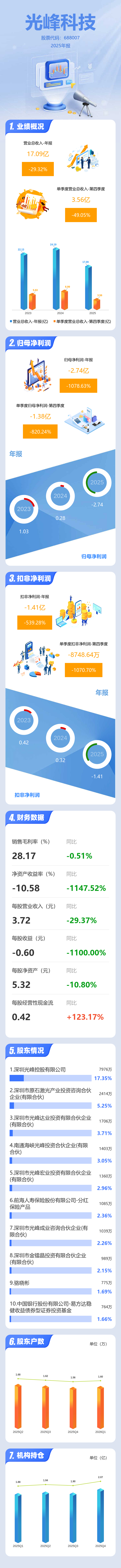 证券之星消息,光峰科技2025年年报显示,当年度公司主营收入17.09亿元,同比下降29.32%;归母净利润-2.74亿元,同比下降1078.63%;扣非净利润-1.41亿元,同比下降539.28%;其中2025年第四季度,公司单季度主营收入3.56亿元,同比下降49.05%;单季度归母净利润-1.38亿元,同比下降820.25%;单季度扣非净利润-8748.64万元,同比下降1070.7%;负债率34.34%,投资收益663.79万元,财务费用1257.97万元,毛利率28.17%。