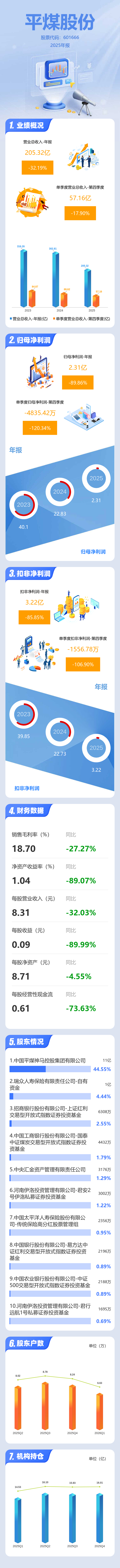 证券之星消息,平煤股份2025年年报显示,当年度公司主营收入205.32亿元,同比下降32.2%;归母净利润2.31亿元,同比下降89.87%;扣非净利润3.22亿元,同比下降85.85%;其中2025年第四季度,公司单季度主营收入57.16亿元,同比下降17.9%;单季度归母净利润-4835.42万元,同比下降120.34%;单季度扣非净利润-1556.78万元,同比下降106.9%;负债率65.15%,投资收益8913.48万元,财务费用10.01亿元,毛利率18.7%。