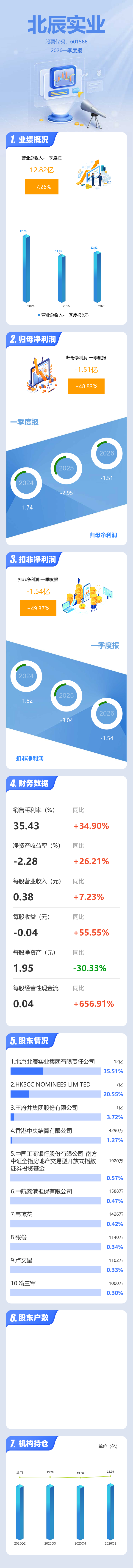 证券之星消息,北辰实业2026年一季报显示,一季度公司主营收入12.82亿元,同比上升7.26%;归母净利润-1.51亿元,同比上升48.83%;扣非净利润-1.54亿元,同比上升49.37%;负债率78.89%,投资收益349.18万元,财务费用2.08亿元,毛利率35.43%。