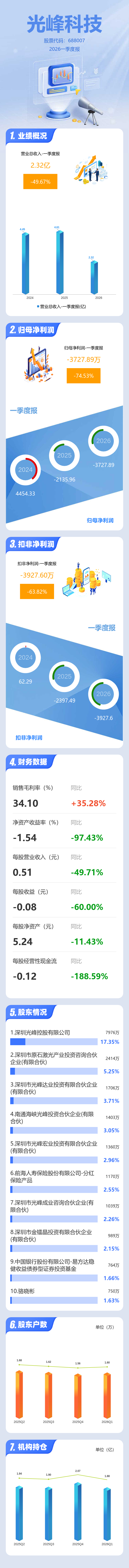 证券之星消息,光峰科技2026年一季报显示,一季度公司主营收入2.32亿元,同比下降49.67%;归母净利润-3727.89万元,同比下降74.53%;扣非净利润-3927.6万元,同比下降63.82%;负债率31.43%,投资收益17.0万元,财务费用685.04万元,毛利率34.1%。