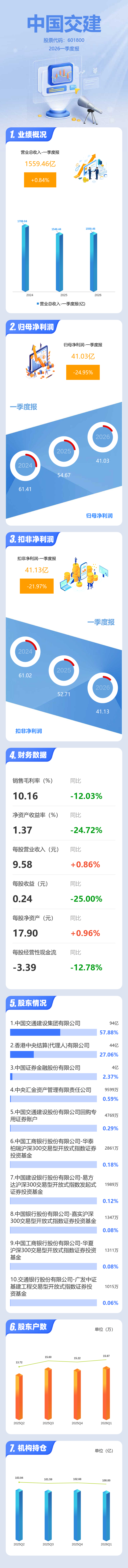 证券之星消息,中国交建2026年一季报显示,一季度公司主营收入1559.46亿元,同比上升0.84%;归母净利润41.03亿元,同比下降24.95%;扣非净利润41.13亿元,同比下降21.97%;负债率77.87%,投资收益9.19亿元,财务费用16.28亿元,毛利率10.16%。