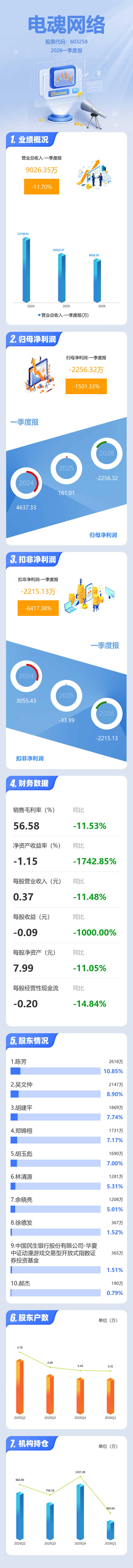 证券之星消息,电魂网络2026年一季报显示,一季度公司主营收入9026.35万元,同比下降11.71%;归母净利润-2256.32万元,同比下降1501.33%;扣非净利润-2215.13万元,同比下降6417.38%;负债率12.31%,投资收益265.11万元,财务费用154.94万元,毛利率56.58%。