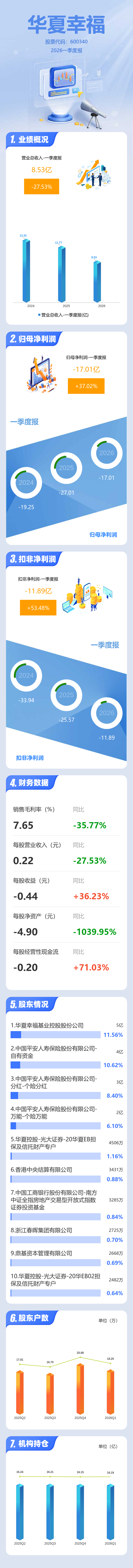 证券之星消息,华夏幸福2026年一季报显示,一季度公司主营收入8.53亿元,同比下降27.53%;归母净利润-17.01亿元,同比上升37.03%;扣非净利润-11.89亿元,同比上升53.49%;负债率102.62%,投资收益-2.26亿元,财务费用9.62亿元,毛利率7.65%。