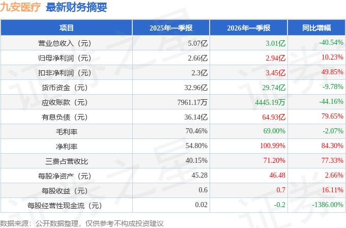 据证券之星公开数据整理,近期九安医疗(002432)发布2026年一季报。截至本报告期末,公司营业总收入3.01亿元,同比下降40.54%,归母净利润2.94亿元,同比上升10.23%。按单季度数据看,第一季度营业总收入3.01亿元,同比下降40.54%,第一季度归母净利润2.94亿元,同比上升10.23%。本报告期九安医疗三费占比上升明显,财务费用、销售费用和管理费用总和占总营收同比增幅达77.33%。