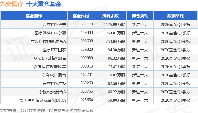持有九安医疗最多的基金为医疗ETF华宝,目前规模为279.96亿元,最新净值0.3384(4月29日),较上一交易日下跌0.06%,近一年上涨8.6%。该基金现任基金经理为张放。