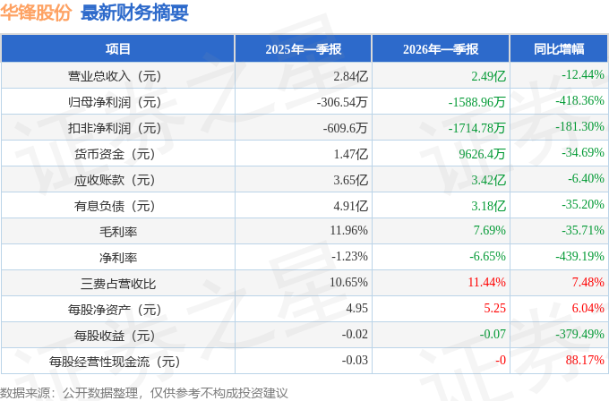 据证券之星公开数据整理,近期华锋股份(002806)发布2026年一季报。根据财报显示,华锋股份净利润同比下降418.36%。截至本报告期末,公司营业总收入2.49亿元,同比下降12.44%,归母净利润-1588.96万元,同比下降418.36%。按单季度数据看,第一季度营业总收入2.49亿元,同比下降12.44%,第一季度归母净利润-1588.96万元,同比下降418.36%。