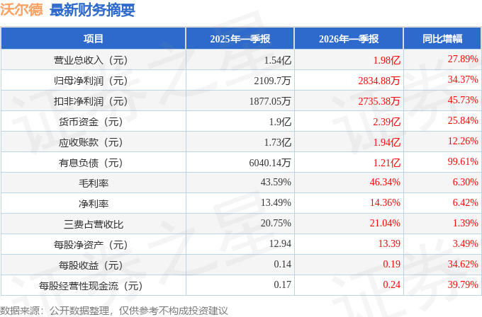据证券之星公开数据整理,近期沃尔德(688028)发布2026年一季报。截至本报告期末,公司营业总收入1.98亿元,同比上升27.89%,归母净利润2834.88万元,同比上升34.37%。按单季度数据看,第一季度营业总收入1.98亿元,同比上升27.89%,第一季度归母净利润2834.88万元,同比上升34.37%。本报告期沃尔德盈利能力上升,毛利率同比增幅6.3%,净利率同比增幅6.42%。