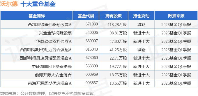 持有沃尔德最多的基金为西部利得事件驱动股票A,目前规模为8.79亿元,最新净值4.6172(4月29日),较上一交易日上涨1.35%,近一年上涨82.5%。该基金现任基金经理为张昌平。