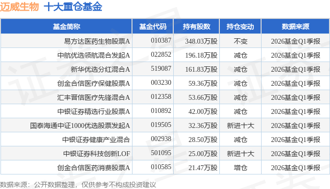 持有迈威生物最多的基金为易方达医药生物股票A,目前规模为19.96亿元,最新净值0.8025(4月29日),较上一交易日下跌0.86%,近一年上涨13.67%。该基金现任基金经理为杨桢霄 许征。