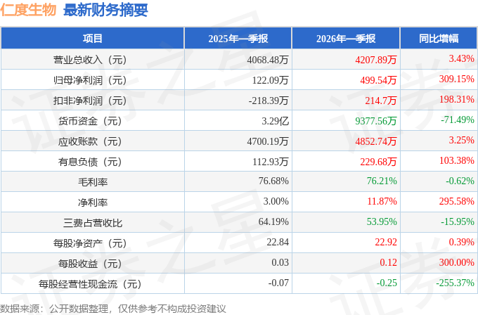 据证券之星公开数据整理,近期仁度生物(688193)发布2026年一季报。截至本报告期末,公司营业总收入4207.89万元,同比上升3.43%,归母净利润499.54万元,同比上升309.15%。按单季度数据看,第一季度营业总收入4207.89万元,同比上升3.43%,第一季度归母净利润499.54万元,同比上升309.15%。本报告期仁度生物公司应收账款体量较大,当期应收账款占最新年报归母净利润比达481.07%。