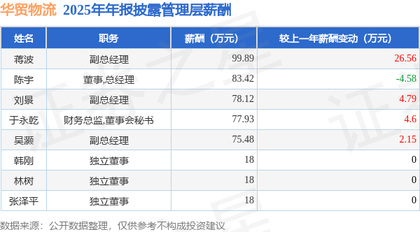 证券之星消息,华贸物流发布2025年年报,数据显示:公司主营收入179.64亿元,同比增2.51%。归母净利润为4.88亿元,同比减9.37%。扣非净利润为3.76亿元,同比减18.91%。当年公司员工总数3942人,同比减3.5%。人均薪酬23.8万元(注:"人均薪酬"根据定期报告中"应付职工薪酬"附注的本期增加值 / 员工总数计算而来),同比减11.28%。人均创收455.71万元,同比增6.23%。人均创利13.14万元,同比减4.56%。其中管理层薪酬总额为468.84万元,同比上一年减18.71%,薪酬最高的为副总经理蒋波,薪酬99.89万元。