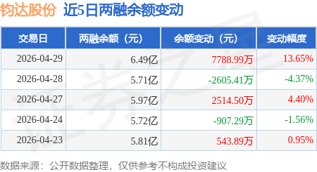 证券之星消息,4月29日,钧达股份(002865)融资买入1.76亿元,融资偿还9794.87万元,融资净买入7785.08万元,融资余额6.48亿元,近20个交易日中有11个交易日出现融资净买入。