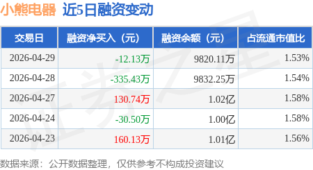 证券之星消息,4月29日,小熊电器(002959)融资买入389.86万元,融资偿还401.99万元,融资净卖出12.13万元,融资余额9820.11万元。