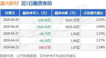 证券之星消息,4月29日,晨光新材(605399)融资买入629.46万元,融资偿还856.06万元,融资净卖出226.6万元,融资余额9243.79万元。