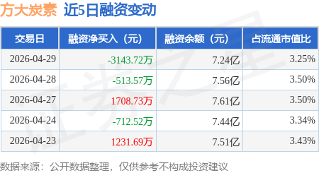 证券之星消息,4月29日,方大炭素(600516)融资买入2093.81万元,融资偿还5237.53万元,融资净卖出3143.72万元,融资余额7.24亿元。
