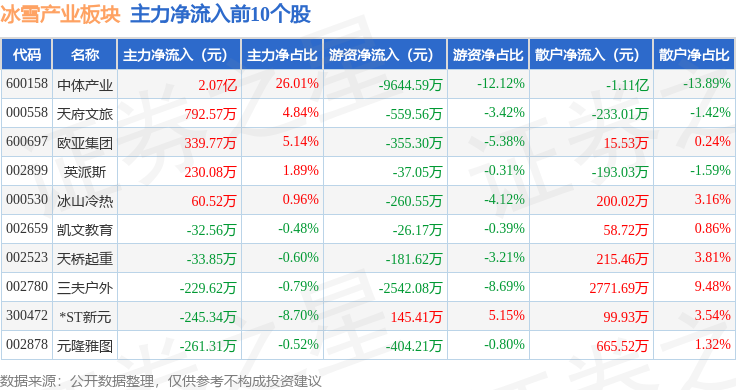 从资金流向上来看,当日冰雪产业板块主力资金净流出2685.83万元,游资资金净流出7586.66万元,散户资金净流入1.03亿元。冰雪产业板块个股资金流向见下表: