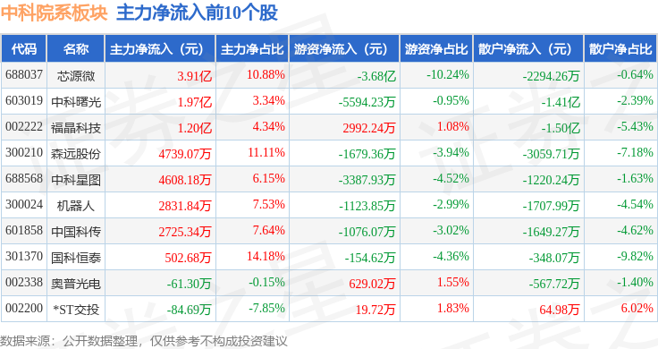 从资金流向上来看,当日中科院系板块主力资金净流入6.38亿元,游资资金净流出4.31亿元,散户资金净流出2.07亿元。中科院系板块个股资金流向见下表: