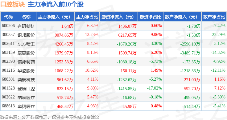 从资金流向上来看,当日口腔板块主力资金净流出5.24亿元,游资资金净流入2.91亿元,散户资金净流入2.32亿元。口腔板块个股资金流向见下表: