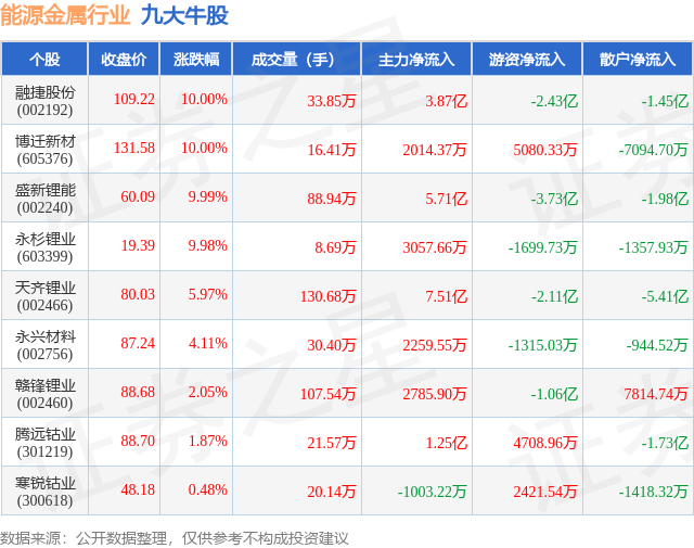个股表现方面,能源金属行业当日领涨股为融捷股份(002192),该股当日报收109.22,上涨10.0%,成交量33.85万,主力资金净流入3.87亿元。博迁新材(605376)以上涨10.0%紧随其后,该股当日成交量16.41万,主力资金净流入2014.37万元。除此之外,盛新锂能(002240)、永杉锂业(603399)、天齐锂业(002466)均进入当日牛股之列。具体个股列表见下表: