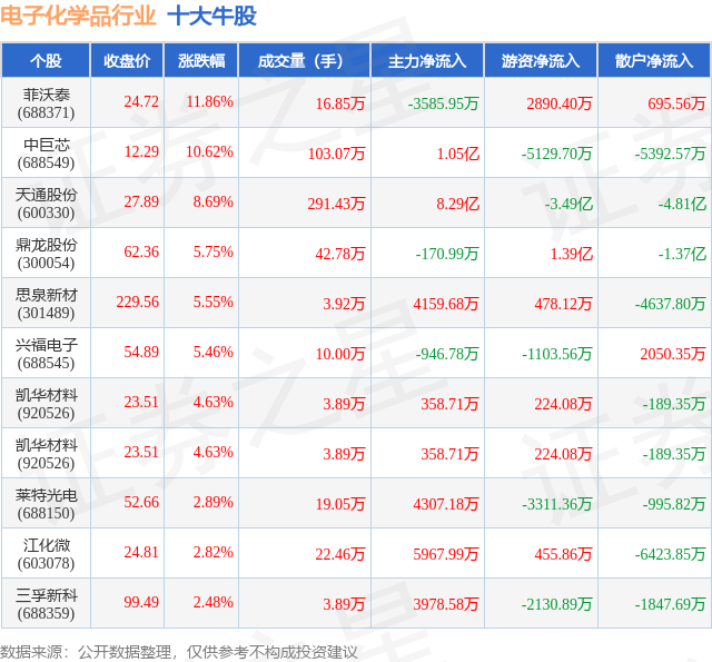 个股表现方面,电子化学品行业当日领涨股为菲沃泰(688371),该股当日报收24.72,上涨11.86%,成交量16.85万,主力资金净流出3585.95万元。中巨芯(688549)以上涨10.62%紧随其后,该股当日成交量103.07万,主力资金净流入1.05亿元。除此之外,天通股份(600330)、鼎龙股份(300054)、思泉新材(301489)均进入当日牛股之列。具体个股列表见下表: