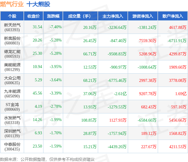 个股表现方面,燃气行业当日领跌股为新天然气(603393),该股当日报收31.54,下跌7.4%,成交量20.16万,主力资金净流出3236.64万元。新奥股份(600803)以下跌5.28%紧随其后,该股当日成交量26.45万,主力资金净流出847.4万元。除此之外,德龙汇能(000593)、美能能源(001299)、大众公用(600635)均进入当日熊股之列。具体个股列表见下表: