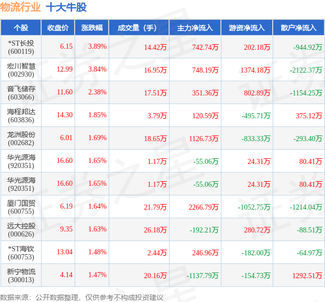 个股表现方面,物流行业当日领涨股为*ST长投(600119),该股当日报收6.15,上涨3.89%,成交量14.42万,主力资金净流入742.74万元。宏川智慧(002930)以上涨3.84%紧随其后,该股当日成交量16.95万,主力资金净流入748.19万元。除此之外,音飞储存(603066)、海程邦达(603836)、龙洲股份(002682)均进入当日牛股之列。具体个股列表见下表: