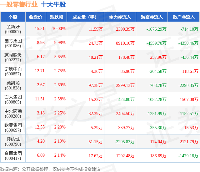 个股表现方面,一般零售行业当日领涨股为全新好(000007),该股当日报收15.51,上涨10.0%,成交量11.59万,主力资金净流入2390.39万元。国芳集团(601086)以上涨9.98%紧随其后,该股当日成交量24.73万,主力资金净流入8910.16万元。除此之外,友阿股份(002277)、宁波中百(600857)、美凯龙(601828)均进入当日牛股之列。具体个股列表见下表:
