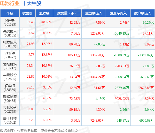 个股表现方面,电池行业当日领涨股为N理奇(301599),该股当日报收62.4,上涨348.6%,成交量42.25万,主力资金净流入7.51亿元。先惠技术(688155)以上涨20.0%紧随其后,该股当日成交量7.06万,主力资金净流入5259.08万元。除此之外,德方纳米(300769)、ST合纵(300477)、铜冠铜箔(301217)均进入当日牛股之列。具体个股列表见下表: